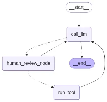 After running the client, your graph diagram will now include a human review node between the LLM and tool execution stages: